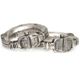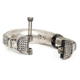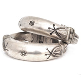 This is a wonderful pair of Gudjarati hinged cuffs. They are hefty silver, and while, to some, the design might be a bit abrupt, they feature amazing little details. They have a barely visible prayer stippled into the side. They are marked with an R & M and they have exuberant stampwork. A very wearable size with a comfortable fit.