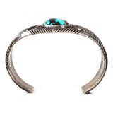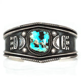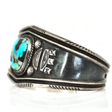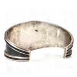 A spectacular Native American cuff by an unknown artist. It features a finely crafted raised design evocative of a Katchina doll. The stone is incredibly vibrant with high contrast black marbling. An A+ across the board. Marked with a scratched '12' on the interior.