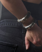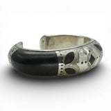 One of a collection of pieces made in collaboration with a Tuareg artist from Niger. A beautifully graphic and bold cuff bracelet that exhibits the intricate scribe work that comes out of the Saharan Desert. Lined in pure sterling silver for a smooth, healing touch.