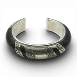One of a collection of pieces made in collaboration with a Tuareg artist from Niger. A beautifully graphic and bold cuff bracelet that exhibits the intricate scribe work that comes out of the Saharan Desert. Lined in pure sterling silver for a smooth, healing touch.