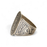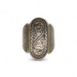 A special cigar band ring from Central Asia. It shows a twisted botanical design, in graphic silver and niello.