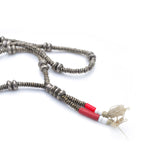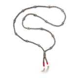 This is a nice, weighty strand of low grade silver beads, finished with a lariat that has a rather smart sensibility. Just long enough to slip over they head and with a perfect red-accented drop, it is sure to become a favorite.