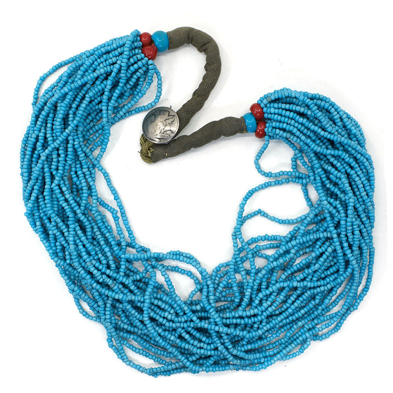What gorgeous necklace! 30 strands of turquoise glass seed beads will drape your neck, finished with a heartwarmingly simple cloth wrap and a beautiful sterling Buffalo Nickel.