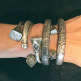 These North African bangles are unique on several fronts. They are incredibly heavy with lots of high-grade silver. They are forged, not sandcast and they have a design that feels more like the architectural painting of Burkina Faso than the geometry of the Tuareg. We jump when we find tribal jewelry that doesn't quite fit in the box because it alludes to the artistic vision of the craftsman, while working within a cultural vernacular. Sold as a pair.