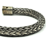 We become accustom to the regularity of machine work so that when something familiar is made completely by hand, it is gob stopping. This HEAVY silver rope is handwoven and closes with a clever and functional mechanism. A on-of-a-kind artisan fine.