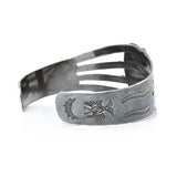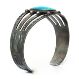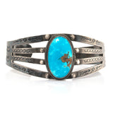 A classic Native American bracelet with a very bright blue turquoise stone and clean, clear stamp work. The stamps feature a double-headed thunderbird.