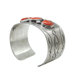 This excellent Navajo cuff is large and in charge! Thick gauge silver with with a simple hand-engraved pattern creates the framework to present three gorgeous natural corals in coveted primary red. This is a powerful piece for wearing and collecting.