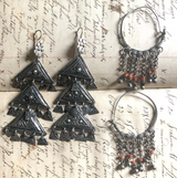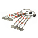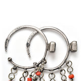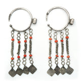 This is a spectacular pair of early 20th c. Berber earrings with long curtain chains, embellished with patinaed salmon coral and engraved diamonds. They can be worn over the ear, or with a gauged earholes. Personally I think they would be beautifully framed as part of a collection.