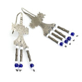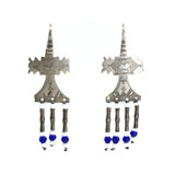 Here are a fascinating pair of Tuareg Earrings from Mauritania. They have gorgeous geometric engraving on the uniquely Tuareg shape. Unfortunately, one earring has broken and lost one of the 4 tassels. The gauge of the ear wire a larger than standard Western ear holes.