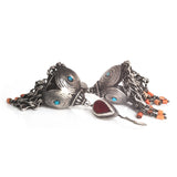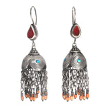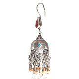 Uzbek design can be quite bold and these earrings are no exception, at nearly 4" long they command attention as they jingle. Wearable, but heavy. Missing 2 of the turquoise dots on the back side of one earring.