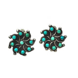 Pretty whirling flowers speckled with bright turquoise dots. An easy and classic Zuni earring. Clip back.
