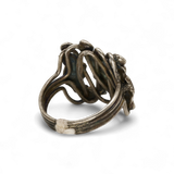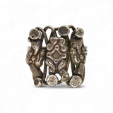 This is a puzzle ring depicting 2 sages in the shoulders. As with all puzzle rings it can be separated into a chain of thing rings, and reassembled. it is tied securely with an antique thread.