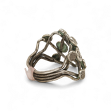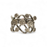 A Chinese puzzle ring with a graphic dot motif. It has gorgeous 100 year old patina. As with all puzzle rings it can be separated into a chain of thing rings, and reassembled. it is tied securely with an antique pink thread.