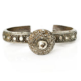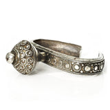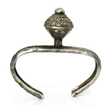 This is a rare and fascinating piece of jewelry from East Timor. It would be worn not as a cuff bracelet but along the first joint of the fingers by a drummer. The slight rattle in the head would accompany the beat of a drum for a ceremony. You may wear it this way, however, it is also wearable as a more traditional cuff bracelet. The body is somewhat malleable so you can get a good fit for your wrist.