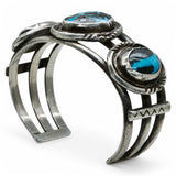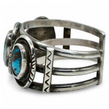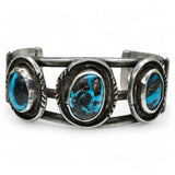 This hefty cuff has strong energy, highlighted by the weighty silver bands and hand-carved settings. The focus is three brilliant blue turquoise stones, each speckled with deep black veins. These are rare and usual stones in a bracket that has the gravitas to honor them