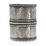 This is a beautiful pair of Turkic Cuffs depicting a winding figure, both representative of a serpent and the wind, everchanging natural elements. These are a larger fit with a little malleability. That paired with the low profile makes them a very wearable wonder-woman look.