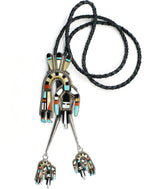 H.E. Cellicion is the name of a Zuni jewelry-making couple, Herbert and Esther Cellicion, who worked together to create mosaic and raised inlay jewelry. Together they made this specular and huge bolo featuring 3 rainbow man dancers. Incredible vision and craftsmanship as well as major wow-factor.