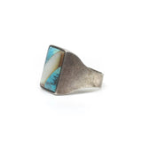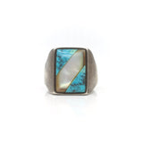 Sleek shapes make this turquoise and mother of pearl ring shine. It has a clean aesthetic, with historic materials.