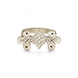This is a great example of the architectural nature of North African jewelry. This towering design is topped with a double club and rises high above the finger. It is a fantastic stacking piece to add texture and warmth to a silver group.  It is from a collection of deadstock 21st c. vintage.