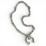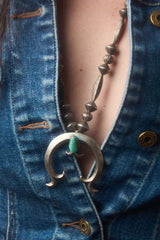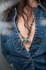 Long and delicate squash blossom necklace. Bench made beads are strung on sterling chain for a lithe and wearable piece. Accented by a removable Naja with Carico Lake turquoise. There is copper staining around the bezel from the solder. It can be cleaned off if you choose.