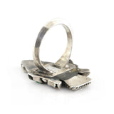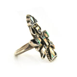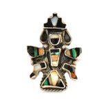 The Zuni figure Knifewing is a half-man, half-eagle, considered to be the ultimate in strength and power. This ring has great age, a century or so and the stones & settings show it. They are very well worn, to me adding to the intrigue of this warrior ring.