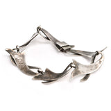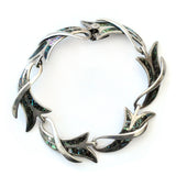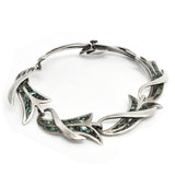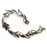 This delicate (but not twee) bracelet rest so gently on the wrist you might forget it is there save for the flashes of rainbow light bouncing off the abalone inlay. The botanical links have fantastic movement and clever design. Box & tongue closure.