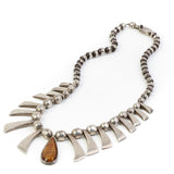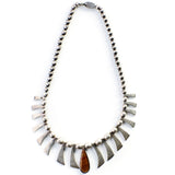 This is a great example of where Mid-century Mexican Design and Native American heritage blend into one another. The solid silver pendants feel both retro and like an ancient reference to a talon amulet. This necklace is made by the famous Sergio Bustamante. It bears a "Sergio" Mark as well as an early Eagle 3.  It is heavy and substantial with excellent drape and wearability.