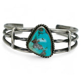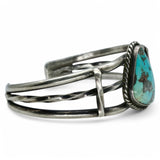 This is a fantastic bracelet with a creamy turquoise stone veined with metallic pyrite. It is in a cage-like setting of hand pulled and twisted wires.