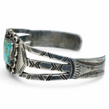 This is a gorgeous and unusual mid-century turquoise cuff. It has elaborate chase work and detailed wirework to provide joyful setting for a fantastic trapezoidal turquoise stone.