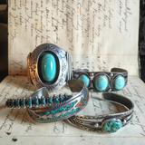 I love this Navajo cuff because of how it bridges the gap between tradition and creativity. It bears many of the marks of historic Native American design; the shadowbox, sawtooth bezel turquoise stone and stampwork to name a few. But the design feels freshly invented. The industrially inspired rail work on the sides and the scale exemplify the artist's inspiration. Signed Eugene J on the back.