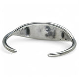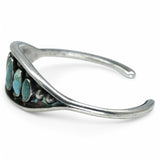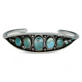 This is a very unique cuff with tubular ends opening into a long eye-shaped shadowbox. The center houses 5 turquoise cabochons. It has a mystic feeling. Signed with a hand-scratched "8"