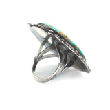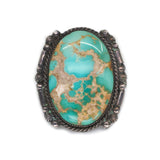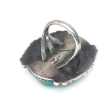Leonard Martza is a famed Zuni jeweler who has been workin in traditional methods since the 1940s. This ring is from a later period, showcasing fine metalwork paired with an exception stone (likely Royson Turquoise). His pieces are collectible. This big, green-blue ring is balanced while being very bold.
