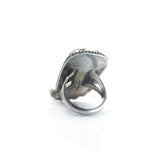 The glorious blue turquoise stone is the highlight of this ring set in a fine rope bezel and accented with a hand-formed feather. The simple split shank is easy and comfortable