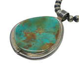If you love turquoise for its magic, than this is the piece for you. This gorgeous stone is the whole show - front and center and in full vibrant glory. It is hung from a wonderful strand on a hand-made sterling bench beads with a satin texture and balanced patina. Signed LB.