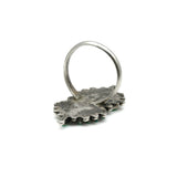 This is a lovely needlepoint turquoise ring with a design that references the 4 winds. The long and narrow shape flatters the hand, and sits with comfort.