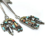 H.E. Cellicion is the working-name of a Zuni jewelry-making couple, Herbert and Esther Cellicion, who worked together to create mosaic and raised inlay jewelry. Together they made this specular and huge bolo featuring 3 rainbow man dancers. Incredible vision and craftsmanship as well as major wow-factor.