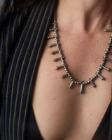 This splendid necklace marries African beads, cast in silver, and Japanese knot work bound in silk. The combination is fabulous. The beads represent phalluses and are intended to bring fertility. The knots are made in the round by a contemporary master, finished with and antique silver button toggle.
