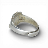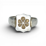This is a Chinese export ring witha shield form emblazoned with a bold flower. It feels regal and timeless. Early 20th C. It is adjustable, hand carved and just darling. It has a very nice soft worn patina.