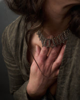 This is a fabulous, fabulous silver fringe necklace. It has a baroque quality and sits luxuriously on the neck. It is likely Rajasthani from the early 20th c. Easy to dress up or layer with your favorite chains and charms.