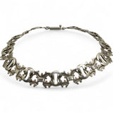 This is a wonderful Midcentury Mexican collar necklace of Aztec inspiration. The bold, design is as show stopping as it is wearable. While there are a plethora of necklaces in this style this one is truly special for its dimensionality. The layers of silver create a depth that is absolutely wonderful.