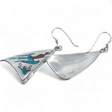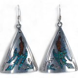 Clean sterling silver triangles are embedded with mosaic coral and turquoise to form a thunderbird design Both powerful and sensual, the movement on these earrings is sure to please.