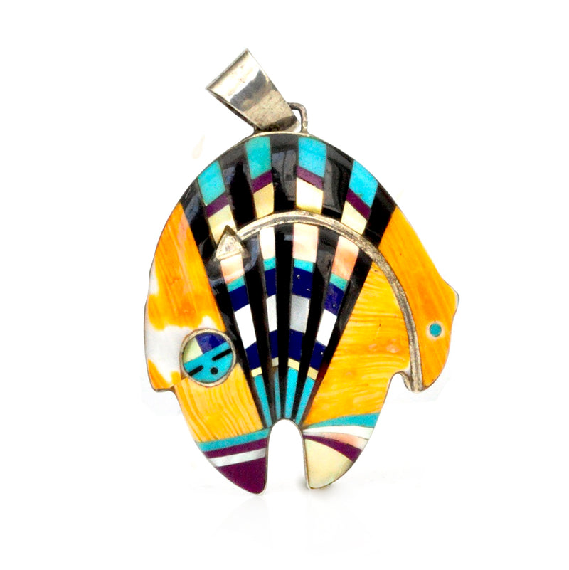 This big and vibrant bear pendant has a radiant design, bisected by a sterling inlay heart line. The heartline draws strength inward.