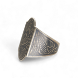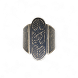 A square band ring from Central Asia. It shows a intertwined heart-shaped leaves in graphic silver and niello.