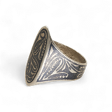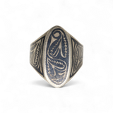A square band ring from Central Asia. It shows a intertwined heart-shaped leaves in graphic silver and niello.