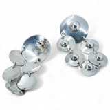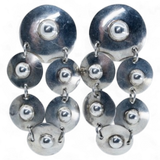 These glorious earrings are a cascade of silver discs with raised nipples, each surface moves independently and shimmers as it does. They were made to dance and a major look! A bold and joyful design from Taxco, Mexico