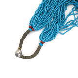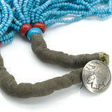 What gorgeous necklace! 30 strands of turquoise glass seed beads will drape your neck, finished with a heartwarmingly simple cloth wrap and a beautiful sterling Buffalo Nickel.
