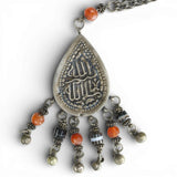 This dangling pendant feels like the epitome of boho pastiche. It has a star of david on one side and writing on the other. The teardrop form is accented by a rings of faceted carnelian and banded agate (a personal favorite).