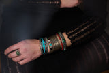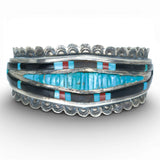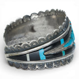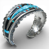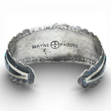 This is a stunning Wayne Paquin Cuff with fabulous, graphic inlay. Inlay materials are turquoise, onyx, wood and jasper. This is a masterful piece that balances rigorous craftsmanship with a wabi-sabi irregularity.