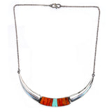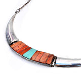 This hand crafted neckalce from the American Southwest is both famierl and unique. It uses traditional materials and tequnices but has a very contemporary and rather chic form. It sits beautifully on the body, both elegant and engy. It is three hinged panels, two are hollowformed sterling and the center has coral and creamy turquoise inlay. A lovely necklace all around.