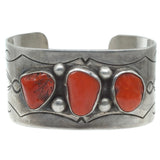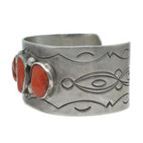 This excellent Navajo cuff is large and in charge! Thick gauge silver with with a simple hand-engraved pattern creates the framework to present three gorgeous natural corals in coveted primary red. This is a powerful piece for wearing and collecting.